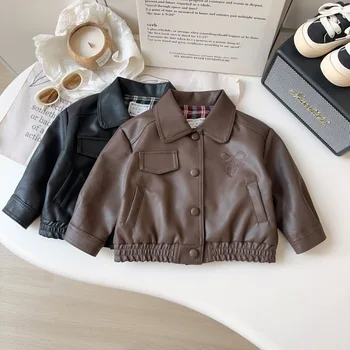 Nuevos modelos en 2026, ropa para niñas, ropa de invierno, chaquetas, trajes para bebés, abrigo de cuero personalizado OEM para bebés con bolsillo frontal